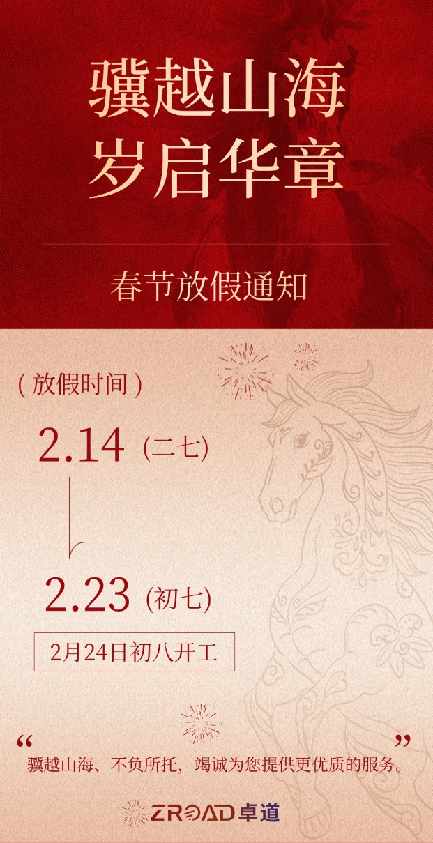 骥越山海,岁启华章 | 2026春节放假通知 更新时间:2026-02-13 18:42/在: 新闻动态 /作者: zroad 尊敬的客户朋友,您好! 根据国家法定假期规定并结合我司情况,现对2026年春节放假安排如下: 2月14日—2月23日放假 2月24日(初八) 开工 放假期间安排: 业务需求可以联系值班客服电话:400-8522-882 任何业务问题可以随时联系您的专属商务顾问 感谢客户朋友长期以来对我司的支持和信任! 2026年,我们仍将骥越山海、不负所托,竭诚为您提供更优质的服务。